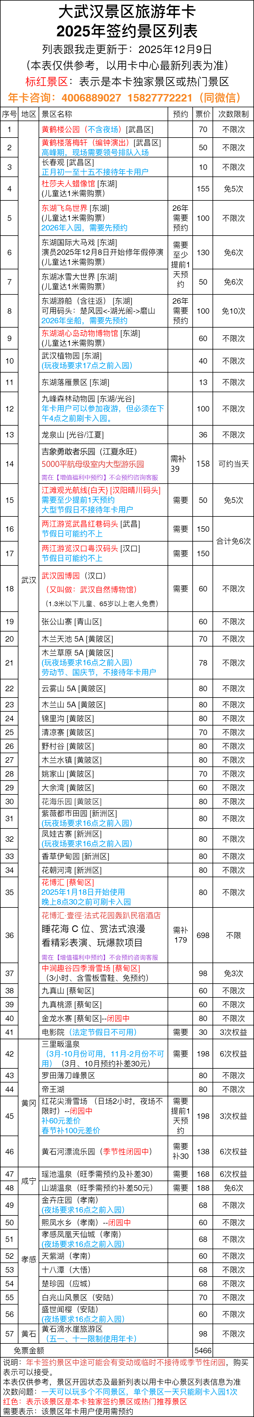 注意:景区列表可能会有变动,年卡景区正常增减不能作为退卡理由。